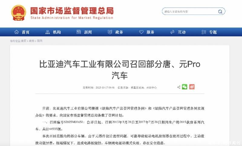 其中,召回编号S2025M0165I:自即日起,召回2015年3月28日至2017年7月28日期间生产的2015款唐系列汽车,共计44535辆。